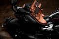 Estética Biker de Vestir: Inspirado en la cultura motociclista clásica, incorpora un arnés de piel genuina con acabados en latón envejecido que aporta una actitud audaz. Es un diseño puramente estético y de moda, ideal para elevar cualquier atuendo sin contar con protecciones técnicas para motociclismo.